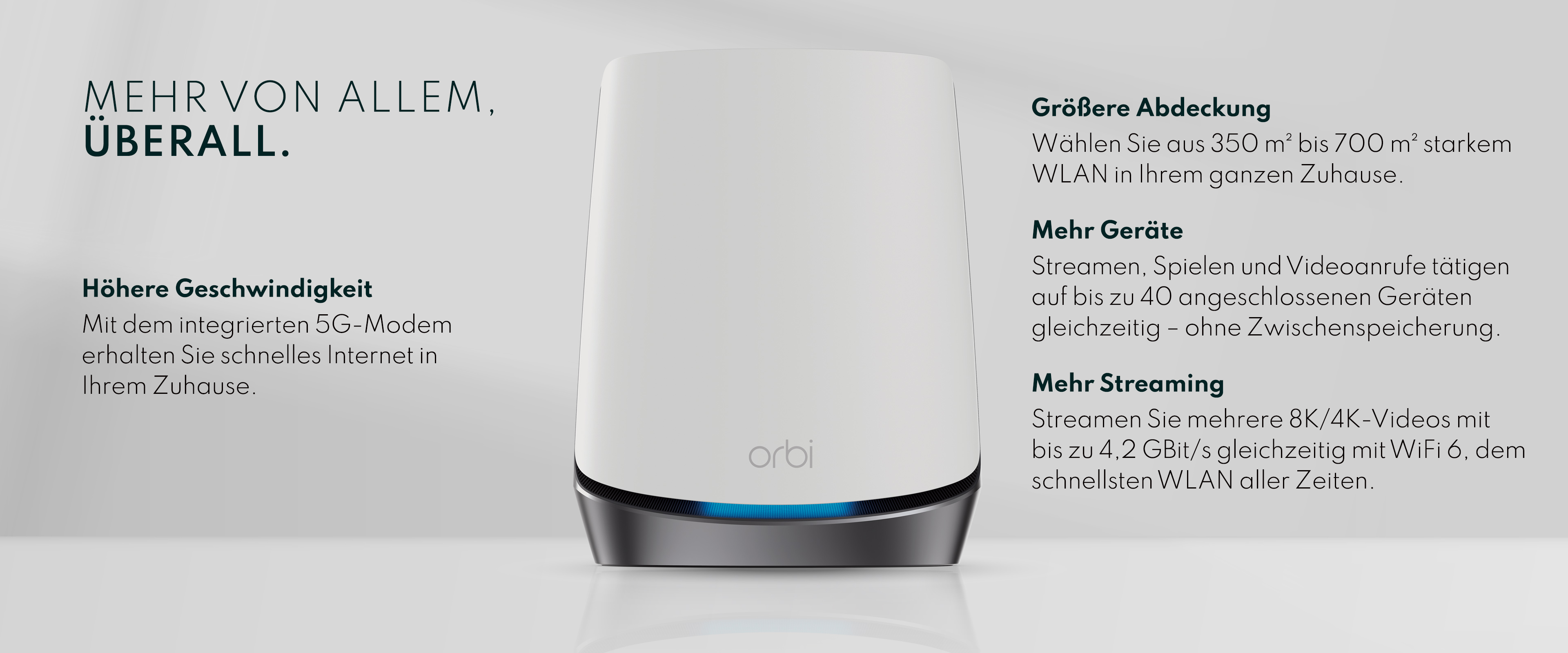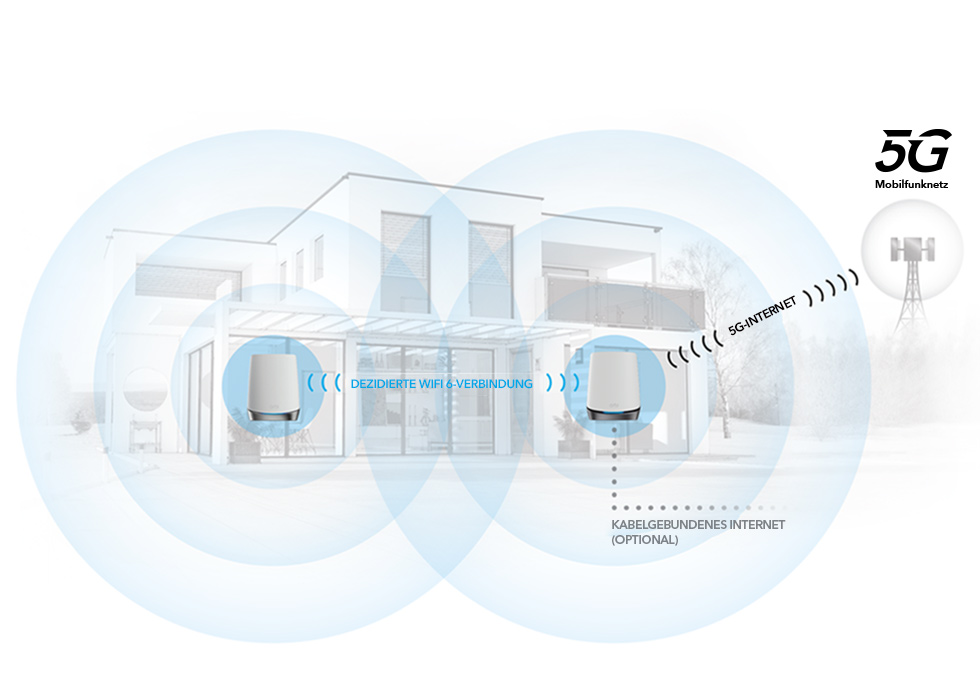 Der Orbi 5G Mesh-System bringt mobile 5G-Technologie in Ihr Zuhause und bietet bis zu 1 Gigabit Internetgeschwindigkeit. Abgedeckt werden bis zu 350m² Fläche mit blitzschneller, zuverlässiger WiFi 6-Technologie, die Geschwindigkeiten von bis zu 4,2 Gbit/s mit bis zu 40 Geräten bietet. Streamen, surfen und arbeiten Sie ununterbrochen in Ihrem ganzen Haus.