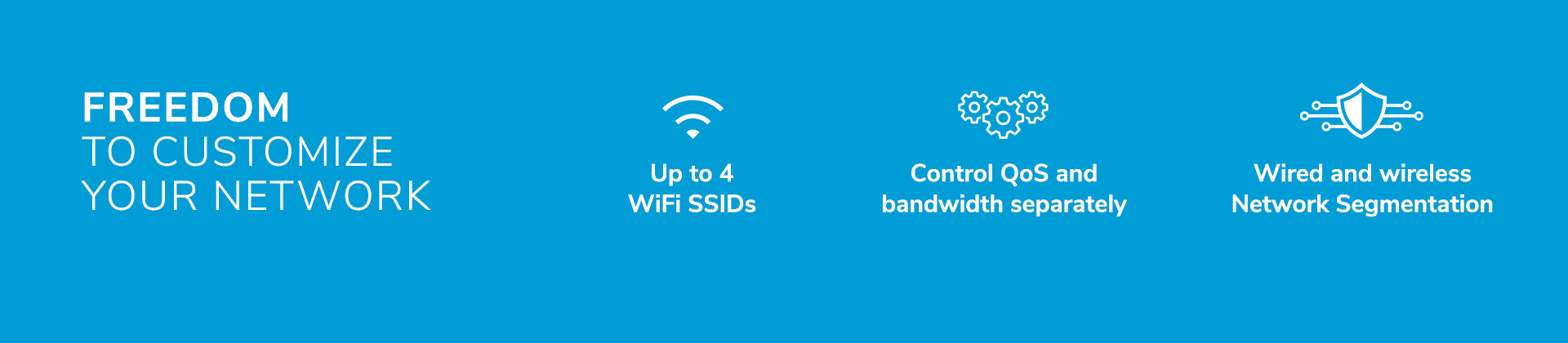 • Security : Four (4) SSID wireless networks (Administration, Employee devices, Guest WiFi, IoT devices), Flexible VLAN configuration on all four (4) SSID WiFi networks, Client isolation by default on Guest SSID and configurable on other SSIDs, WPA/WPA2/WPA3 support,