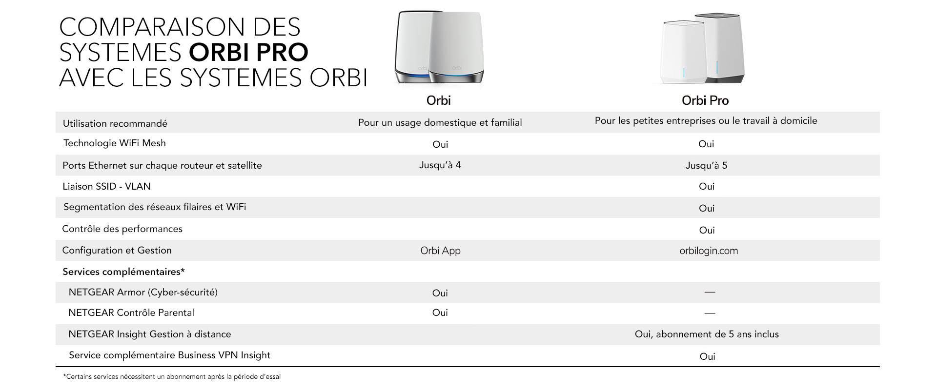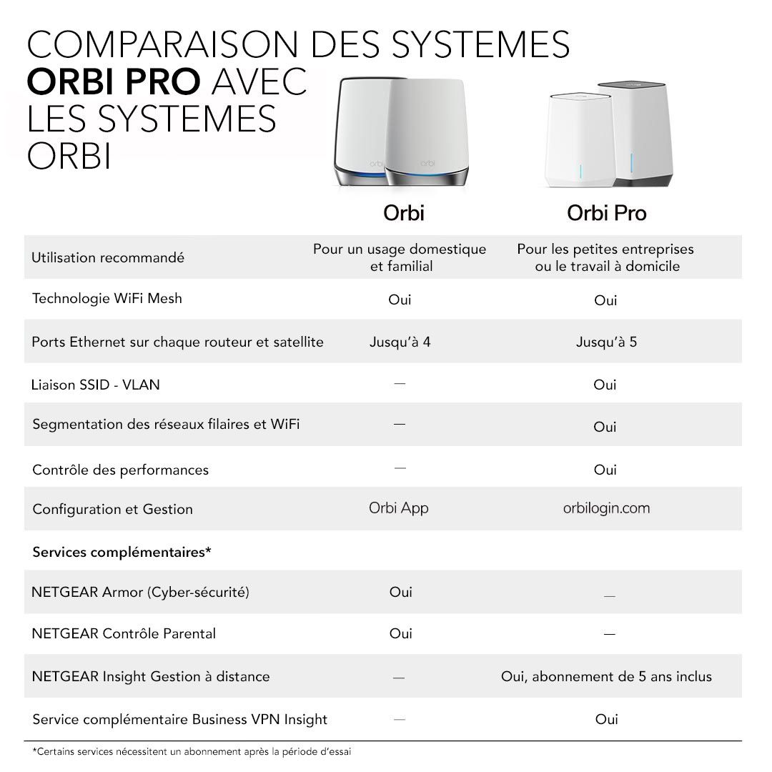 *Essai de 30 jours inclus avec l'achat d'un Orbi Pro. Un routeur Orbi Pro est requis au siège principal et un autre routeur Orbi Pro est requis dans chaque agence ou site distant (y compris chez les collaborateurs).