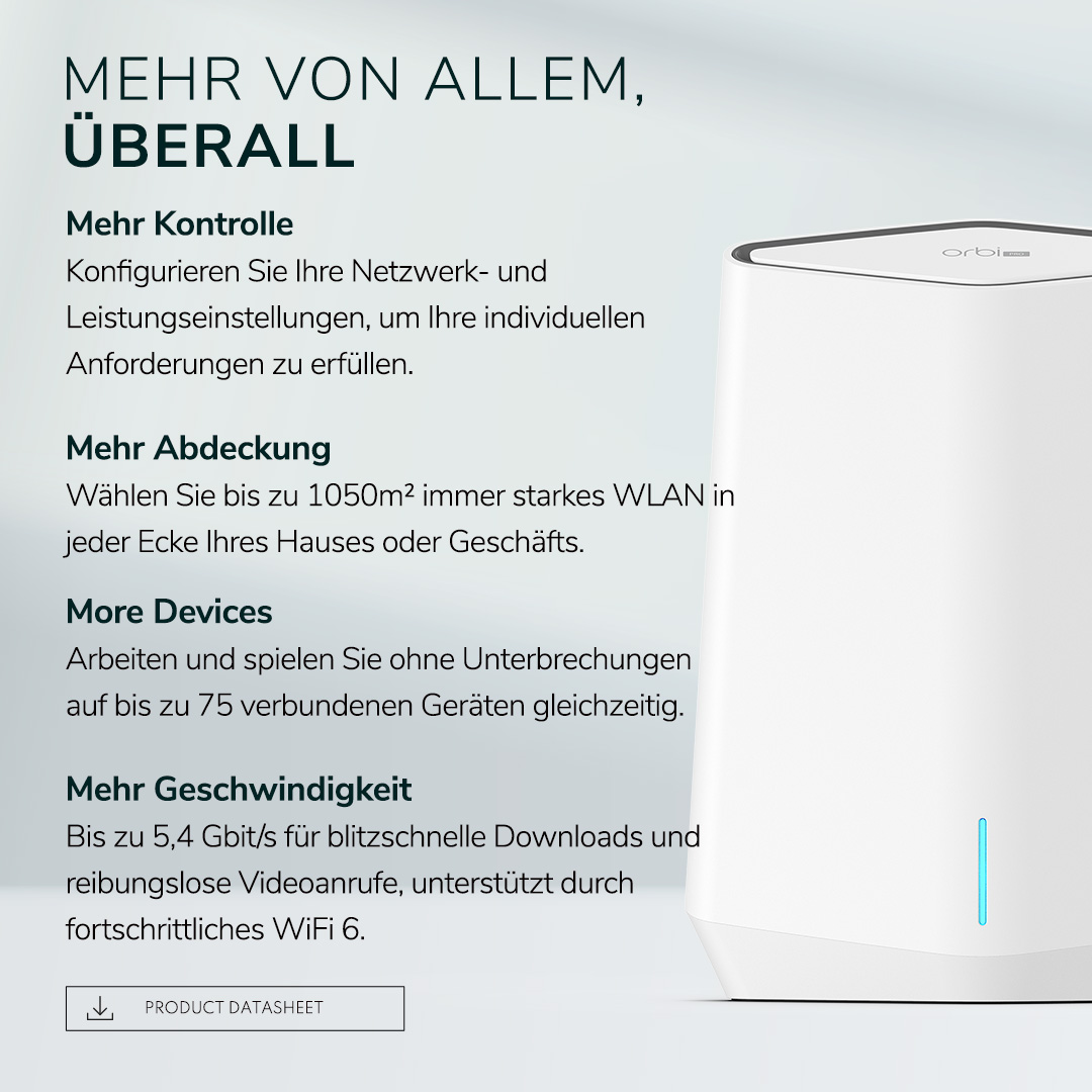Mit dem neuesten, ultimativen Business-WLAN können Sie bis zu 525m² abdecken. Das Orbi Pro WiFi 6 Tri-Band AX5400 Mesh-System umfasst 4 SSIDs, die mit 4 separaten VLANs, Netzwerksegmentierung und Business-VPN verknüpft sind, um die Produktivität von Unternehmen und Heimbüros sowie die Netzwerkleistung zu steigern.