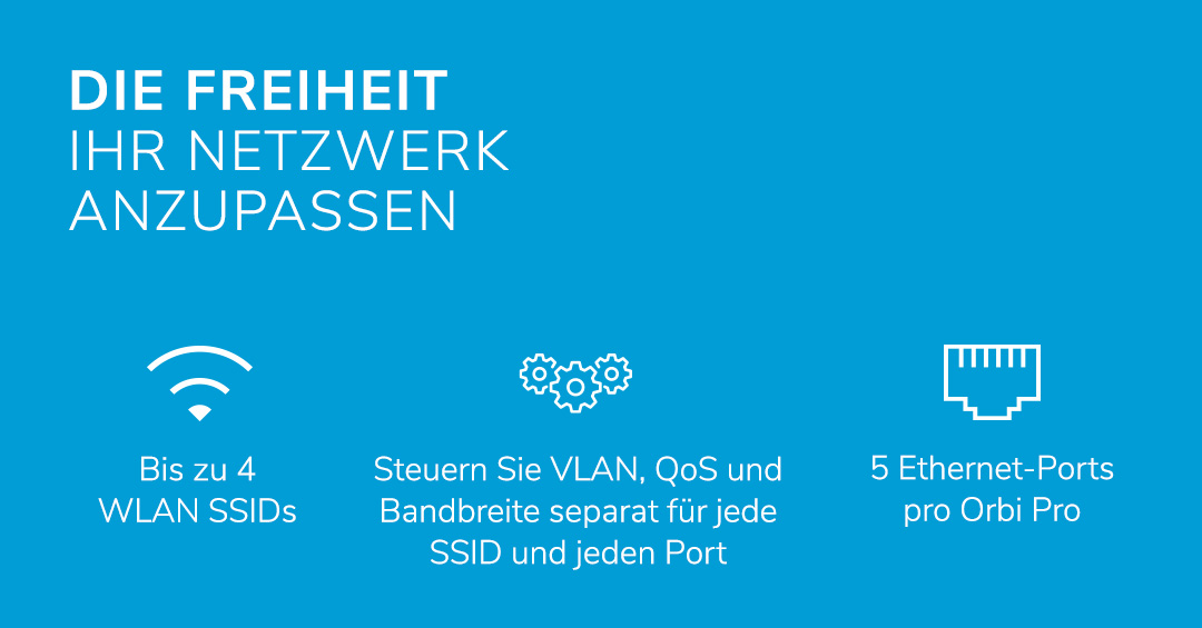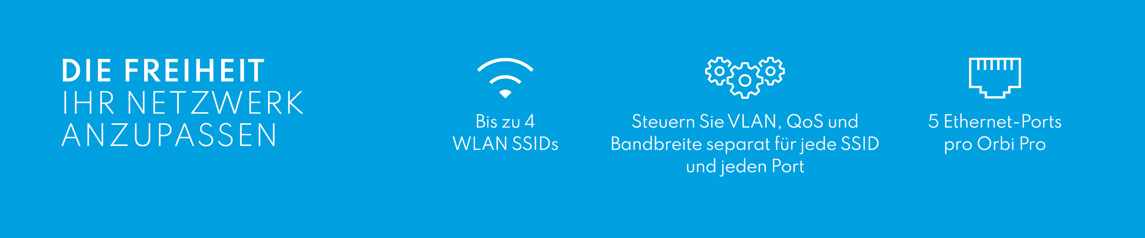 Orbi Pro ist das branchenweit erste Mesh-System, das IP-Segmentierung über drahtgebundene und WLAN-Schnittstellen hinweg unterstützt. Isolieren Sie Netzwerksegmente, indem Sie einzelnen Ethernet-Ports und SSIDs über den Router und alle Satelliten zu einem von Ihnen erstellten VLAN zuweisen.