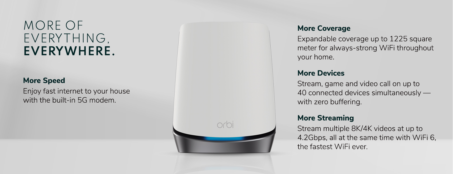 Orbi’s unique shape and height encase ultra-premium, high-power components to deliver significantly better coverage and overall performance than the competition.