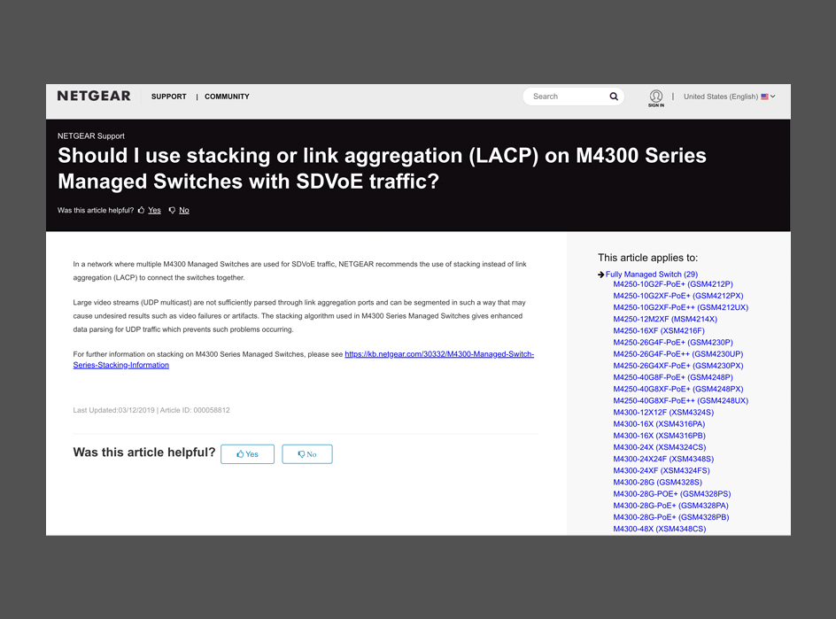 ¿Debo utilizar el apilamiento o la agregación de enlaces (LACP) en los switches administrados de la serie M4300 con tráfico SDVoE?