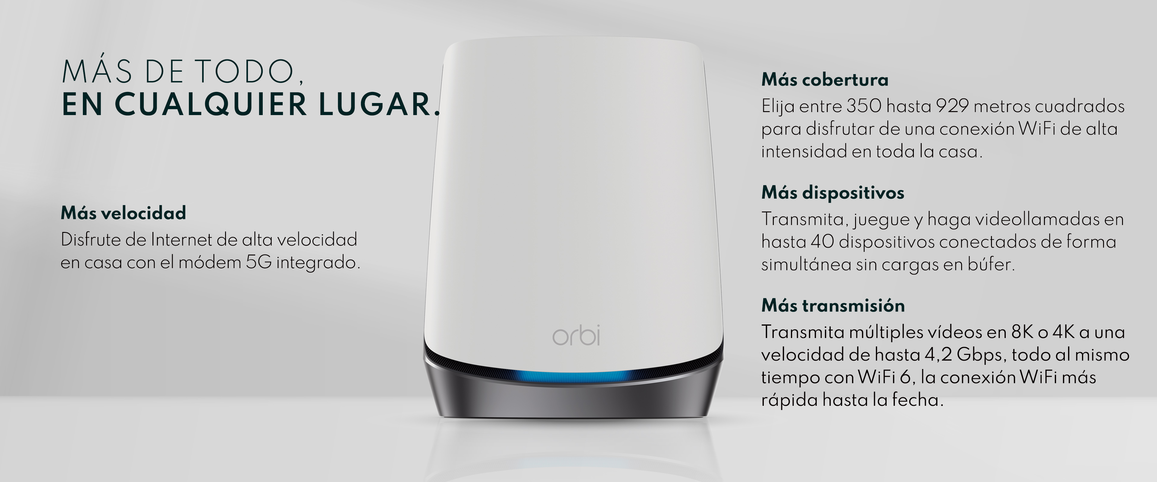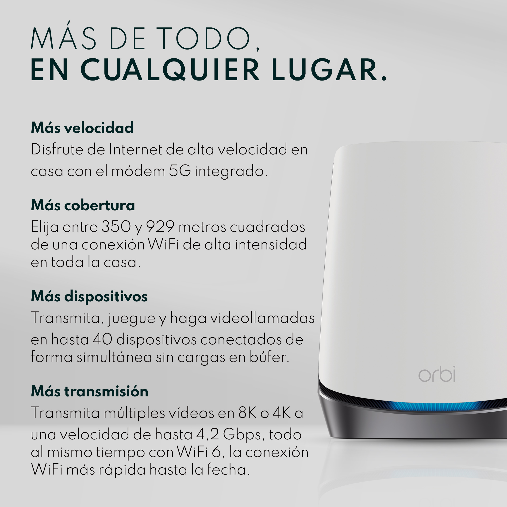 El sistema mesh 5G Orbi incorpora la tecnología móvil 5G a su hogar y ofrece una velocidad de Internet de hasta 1 gigabits. Cubre hasta 250 metros cuadrados con la tecnología WiFi 6 increíblemente rápida y fiable que proporciona velocidades de hasta 4,2Gbps para hasta 40 dispositivos. Transmite, explora y trabaja sin interrupciones en toda tu casa.
