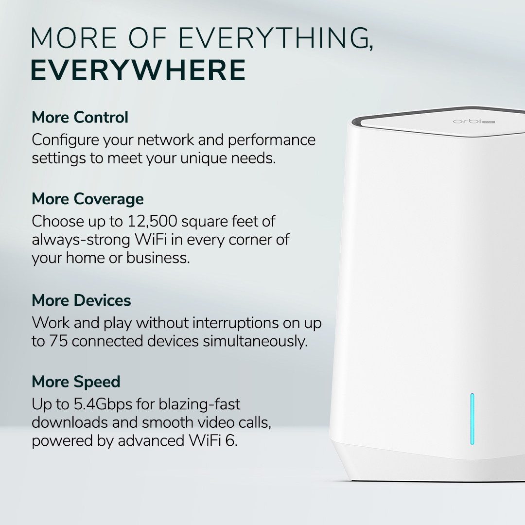 Couvre jusqu'à 600 m2 avec un WiFi dernière génération, pensé pour les professionnels. Le système Orbi Pro WiFi 6 Tri Band AX5400 dispose de 4 SSID permettant de créer 4 réseaux locaux virtuels distincts. La segmentation améliore la productivité et les performances du réseau dans l'entreprises et pour les personnes travaillant à domicile.