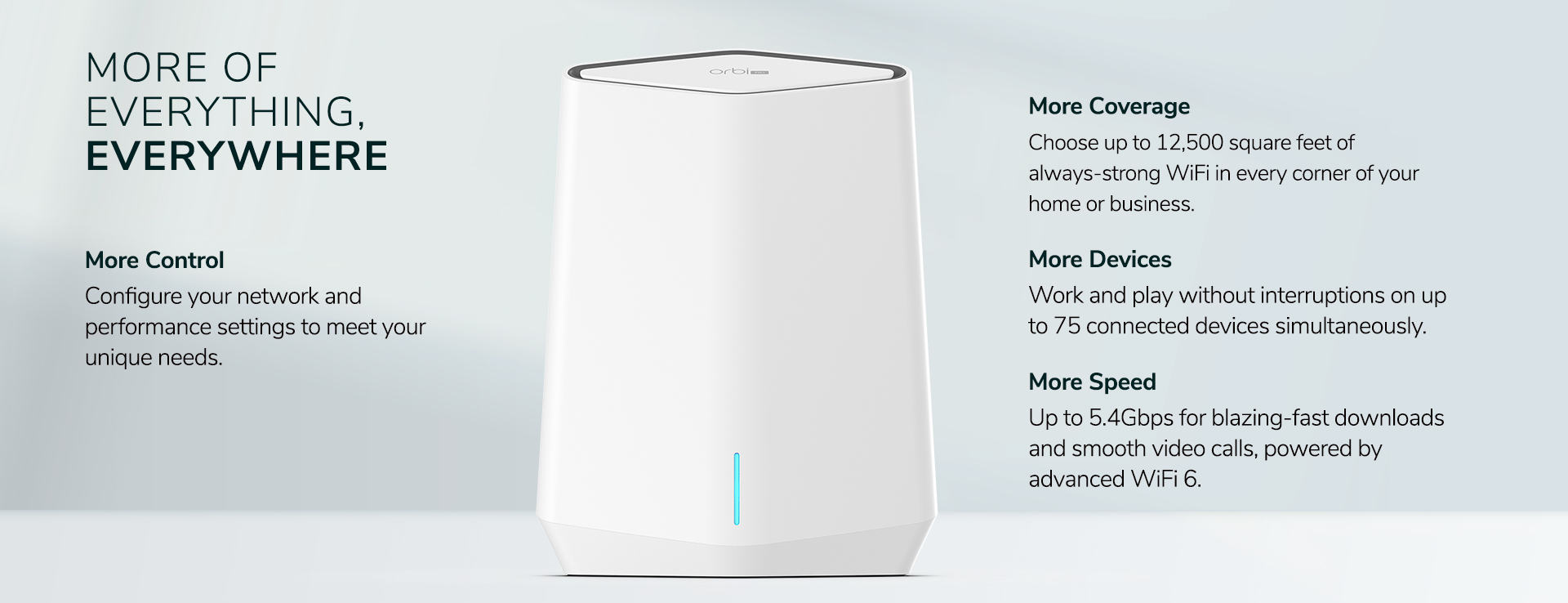 Le design en hauteur unique d'Orbi Pro ainsi que son architecture d'antennes améliorée assurent des signaux Wifi de plus longue portée et plus puissants et une vitesse maximale dans tous les recoins de vos locaux d'entreprise ou dans toutes les pièces de votre maison.