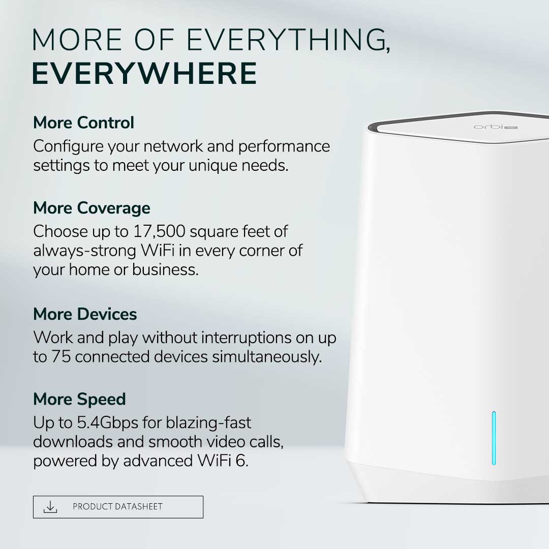 Pokrycie powierzchni do 460m2 dzięki najnowszej, najwyższej klasy Wi-Fi . System WiFi Orbi Pro WiFi 6 Tri-Band AX6000 zawiera 4 identyfikatory SSID połączone z 4 oddzielnymi sieciami VLAN, segmentację sieci i biznesową sieć VPN, aby zwiększyć produktywność i wydajność sieci w firmach i biurach domowych.