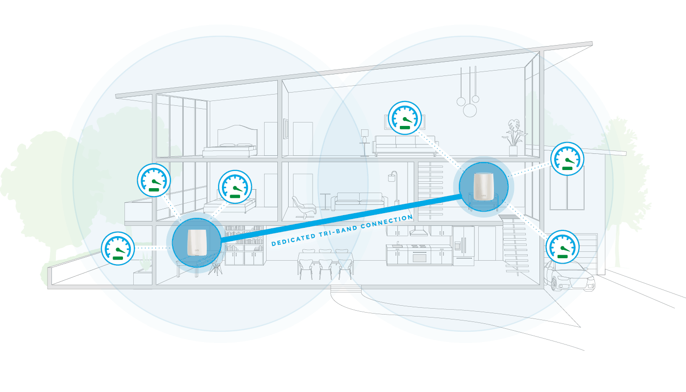 * Na podstawie niezależnych testów przeprowadzanych w rzeczywistych konfiguracjach. Prędkość będzie różnić się w zależności od wielu czynników, takich jak ruch sieciowy, konstrukcja budynku czy odległość od punktów dostępowych. Zajrzyj do artykułu WiFi System Performance – A Difference You’ll Appreciate, gdzie znajdziesz szczegółowe informacje o przeprowadzanych testach. Faktyczne prędkości pobierania i przesyłania mogą być ograniczone przez prędkość Internetu.